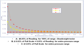 There are two typical methods to mathematically express accuracy in the instrumentation industry. They may be used alone or in combination. These are percentage of full scale and percentage of reading. Percentage of full scale is typically applied to secondary standards and yields a performance that has an error that is consistent throughout the operational range. For example, a unit with a ±0.1% of full scale accuracy on a 3,000 psi instrument would read accurate to ±3.0 psi at any place from 0 to 3,000 psi. A percentage of reading instrument would have a smaller error lower in the scale of the unit. For example, a unit with a ±0.1% of reading accuracy on a 3,000 psi instrument would have an error of ±0.1 psi at 100 psi but ±3 psi at 3,000 psi. The percentage of reading accuracy statements are typically used for primary standards. Combination specifications are starting to be used more frequently and they basically designate that there is a floor specification to the overall accuracy performance of the unit below which there is an expected constant error.